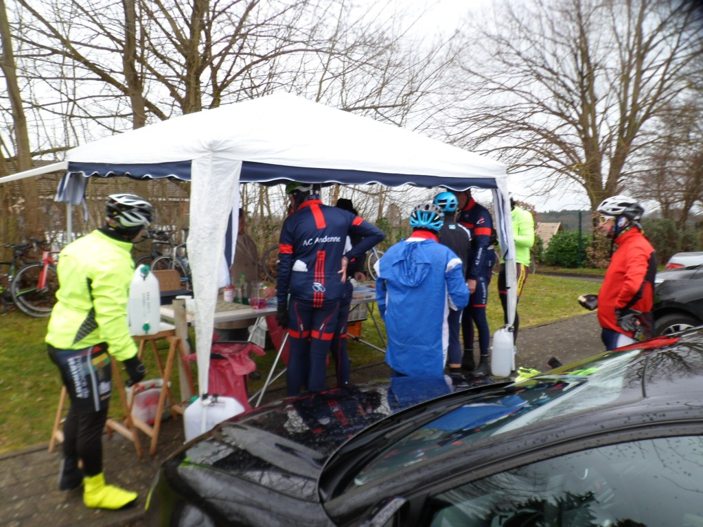 Après mon inscription je prends un premier café qui m’est offert par le club en attendant mon ami Eric qui arrive rapidement. Dégustation du café et inscriptions faites nous allons préparer nos bécanes pour démarrer à 8h28. Le fléchage nous conduit vers Jemeppe s/Sambre – Onoz – Mazy – Corroy le Château – Ardenelle – St Gery – Cortil – Chastre – Blanmont – Hévillers – Mont St Guibert – Beaurieux et Court St Etienne lieu du ravito bienvenu et bien garni comme d’habitude avec ce club. Ensuite nous reprenons la route vers Tangissart – Villers la Ville – Marbais – Les Bons Villers – Mellet – Fleurus – Keumiée – Velaine et retour au pavillon Butacide. Le fléchage est correct malgré l’humidité du jour. Un beau petit parcours rendu très difficile avec le vent. Je crois que le dieu éole s’est fâché car il n’as pas arrêté de souffler et il est même violent par moment, il fallait bien se cramponner au vélo pour éviter la chute. A notre rentrée, éreinté mais heureux comme Ulysse, nous prendrons notre troisième mi-temps en très bonne compagnie avec des amis du Namurois.