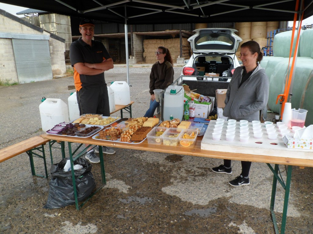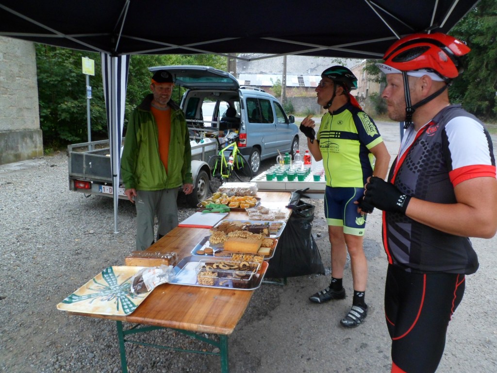 Pour ce samedi et malgré une météo mitigée je vais rendre visite à nos amis du TEAM Faulx Namur qui organisent leur randonnée. Sur place vers 7h15, j’effectue mon inscription ensuite les préparatifs vélo pour me permettre de démarrer à 7h36 avec directement une côte celle de Haut Bois longue de 1500m. J’enchaine avec Reppe,Ohey,Perwez, Marchin et Vyle-Tharoul lieu du premier ravito mais aussi une belle côte longue de 1500m. Après avoir remercié les hôtes du jour je continue vers Libois en passant par Tahlier près de la belle ferme château, Evelette , La Béole, Barsy, Bellevue, Schaltin, il est environ 10h20 et je dois faire halte pour revêtir l’imper car dame la pluie s’invite sur le parcours, je traverse ensuite Natoye lorsque mon ami Léon de Bouffioulx me dépasse avec son ami . Puis une voiture rouge me fait des grands signes pour me signaler que es deux amis citer ci-dessus avaient fait une chute car la route descend fortement et c’est une véritable patinoire, avec beaucoup de prudence j’arrive à leur hauteur et m’assure qu’ils n’ont rien de grave, à ce moment un autre cyclo fait également les frais de cette patinoire, on constate alors que la pluie qui tombe a rendu la route dangereuse, mais chacun reprend sa route vers Braibant,Sovet,Thysnes et Lisogne lieu du second ravito et j’apprends que Léon vient juste de quitter le lieu en forme. Après m’être sustenter légèrement je continue vers Loyers Purnode et Spontin en quittant par la gauche la route et aborder une longue, très longue côte que je dois achevé à pied car je ne sais pas ce qu’il s’est passé mais je suis victime d’un saut de chaine, pas le temps de décrocher et patatras je tombe du côte gauche et plus moyen de remonter sur le vélo, heureusement je n’ai qu’un petit bobo au genou gauche, pas de casse, arrivé au sommet je peux enfin reprendre les commandes et continuer vers Mianoye, Assesse,Sorinnes la longue, Gesves et arrivée au local trempé car l’orage s’est également invité n’épargnant personne et inondant certains endroits sur les routes. Je vais faire homologuer mon parcours et boire une bonne bière bien méritée mais complètement mouillé . Voila un parcours bien fléché mais relativement tracé pour des costaux qui marquera les esprits tant la météo n’a pas donné le choix.