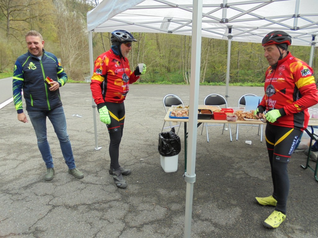 Samedi je me rends à Auvelais pour la rando organisée par le Vélo Loisir Sambreville, arrivé sur place vers 7h50 , ma préinscription établie, je salue des amis présents puis prépare ma monture. Je démarre à 8h06, la trace me dirige vers Falisolle où j’aurai une portion de Ravel de plus où moins 15km et sortie à Graux, Ermeton-sur-Biert, Falaen gare, Maredsous lieu du ravito bien garni au km 35. Ensuite je reprends la route vers Salet et sa belle côte, Bioul, Fosse la Ville, Vitrival , il est 11h15 , la météo a décidé de me tremper obligeant un arrêt pour revêtir l’imper que je garde jusqu’à l’arrivée. Un beau parcours sur des routes tranquilles traversant de beaux villages typiques de la région, un fléchage impeccable et une météo excellente et vers 11h15 comme on manque d’eau, il fallait bien nous arroser.